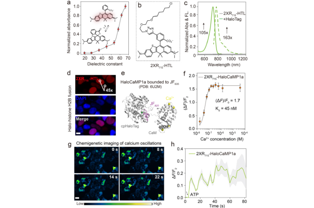 (e-h) 2XR715-HTL結(jié)合HaloCaMP1a 用于體外和293T細(xì)胞內(nèi)的鈣離子傳感。