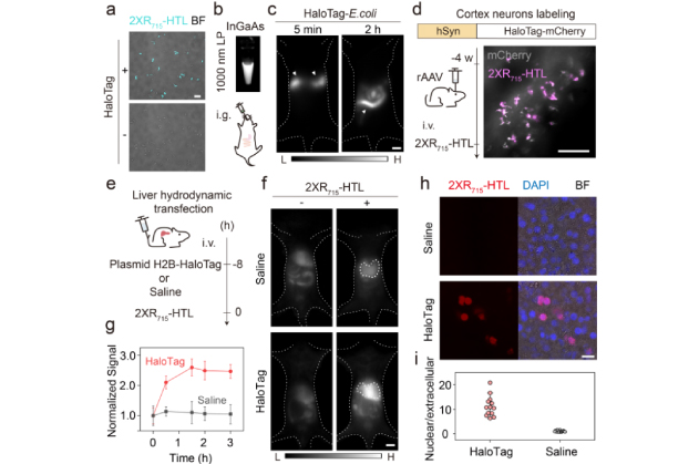 圖 3. (a-c) 2XR715-HTL用于標(biāo)記表達(dá)HaloTag的BL21大腸桿菌的共聚焦成像及小鼠灌胃后的近紅外二區(qū)活體成像結(jié)果。