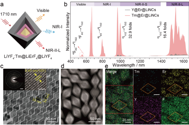 圖1. (a) 本工作開發(fā)的一種可被1710 nm激發(fā)產生反斯托克斯位移發(fā)光的新型稀土納米晶;
