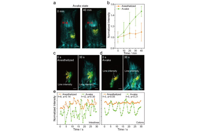 (c-e) 使用三種NIR-IIb的納米探針對小鼠不同生理狀態(tài)下的多重動態(tài)成像結果,提取出的熒光強度隨時間變化反映了大腸和結直腸在清醒和麻醉狀態(tài)下的蠕動差異。