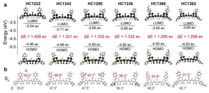 圖2:首先,為了闡明雜原子和甲氧基取代對(duì)HCs染料的電子和幾何性質(zhì)的影響,團(tuán)隊(duì)對(duì)染料進(jìn)行了密度泛函理論(DFT)和含時(shí)密度泛函理論(TDDFT)計(jì)算。結(jié)果表明所有HCs染料的(S0→S1)能級(jí)與λmax,abs的變化趨勢密切相關(guān),而且染料都具有平面的多甲川骨架,但末端的雜環(huán)是非平面的。