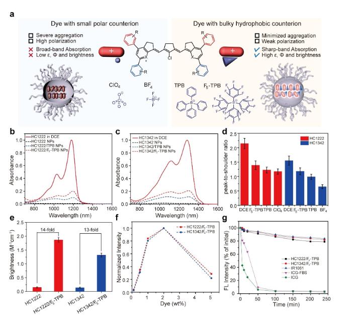 圖3:隨后,團(tuán)隊(duì)發(fā)現(xiàn),和已經(jīng)報(bào)道的近紅外二區(qū)菁染料類似,HCs膠束在水溶液中表現(xiàn)出吸收光譜的衰減和變寬,以及熒光猝滅,這通常可以由ACQ效應(yīng)和不對(duì)稱偶極結(jié)構(gòu)的形成來解釋。為了解決這個(gè)問題,團(tuán)隊(duì)引入反離子配對(duì)策略,使用體積龐大的疏水反離子作為空間間隔物來阻止染料的聚集,也可以作為軟離子來削弱極化。結(jié)果表明,反離子配對(duì)的染料在水溶液中表現(xiàn)出優(yōu)秀的光物理性質(zhì),證明了其在生物成像方面具有潛在的應(yīng)用價(jià)值。