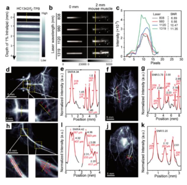 圖4:進(jìn)一步,團(tuán)隊(duì)為了評(píng)估反離子配對(duì)的HCs染料的近紅外二區(qū)激發(fā)成像性能,分別研究了模擬生物組織和真實(shí)生物組織中的光學(xué)穿透性能以及活體成像性能。結(jié)果表明反離子配對(duì)的染料膠束擁有更高的亮度。此外,小鼠的全身血管成像結(jié)果證明了反離子配對(duì)策略提高染料成像性能的有效性,為近紅外二區(qū)激發(fā)的多重生物成像做好了準(zhǔn)備。