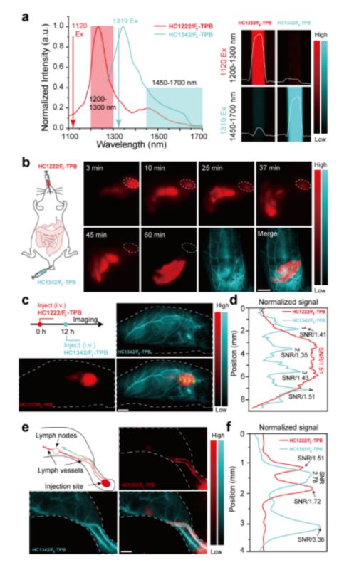 圖5:最后,團(tuán)隊(duì)通過結(jié)合反離子配對(duì)的染料和激發(fā)波長相匹配的激光器構(gòu)建了近紅外二區(qū)激發(fā)雙色成像系統(tǒng),并將該系統(tǒng)成功地用于同時(shí)成像小鼠的血液循環(huán)系統(tǒng)和代謝器官、腫瘤和腫瘤附近的血管系統(tǒng)、小鼠后肢的淋巴系統(tǒng)和血管系統(tǒng)。