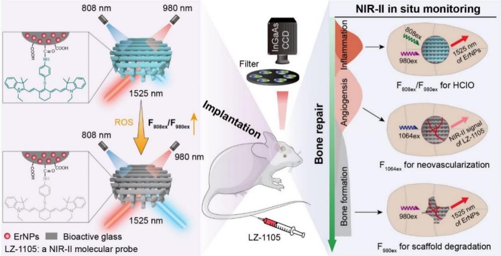 圖1.構(gòu)建近紅外二區(qū)比率熒光生物支架用于原位監(jiān)測(cè)骨修復(fù)過(guò)程示意圖。