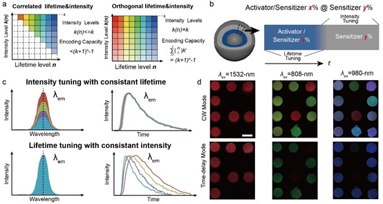 熒光多重編碼能夠在一次制樣中實現(xiàn)對多組分樣品的同步識別,是現(xiàn)代生化研究中高靈敏度、高通量的熒光分析工具。其中編碼的容量決定了整個分析過程的效率,通過對材料光學(xué)性質(zhì)的調(diào)節(jié),可以組合波長、強度、壽命等光學(xué)性質(zhì)提高編碼容量。然而,在實際工作中,熒光物質(zhì)的發(fā)光強度與壽命通常不是獨立可調(diào)的,這使得通過調(diào)節(jié)材料參數(shù)而獲得的多重編碼容量遠遠小于理論值。
