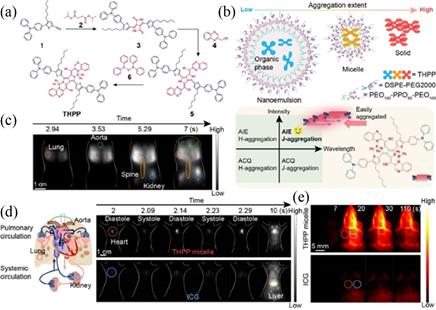 為了應對這一挑戰(zhàn),研究團隊設計以稠環(huán)dibodipy為母核,三苯胺為AIE的功能性官能團,構筑了新型NIR-II區(qū)J聚集AIE發(fā)光染料THPP。其具有較高的摩爾消光系數(shù),而且三苯胺結構保證了聚集熒光增強的性質。此外,THPP穩(wěn)定的稠環(huán)剛性結構使它具備極其優(yōu)良的光穩(wěn)定和化學穩(wěn)定性。作者利用THPP分子制備得到高亮度的膠束,不僅能夠動態(tài)監(jiān)測深層肺臟、腎臟、主動脈弓和頸椎等,更能夠在高幀率下準確監(jiān)測心臟跳動的過程。該工作為解決NIR-II區(qū)染料分子熒光淬滅問題提供了新的策略。