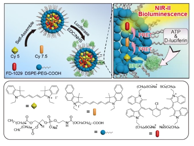 圖1 近紅外第二窗口發(fā)光的生物發(fā)光探針的制備原理及其發(fā)光過(guò)程