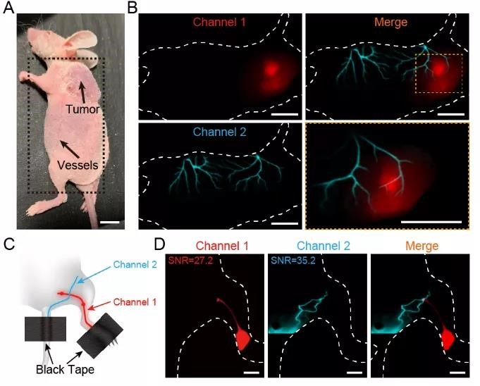 該探針具有良好的生物相容性,成功應(yīng)用于小鼠的血管和淋巴管的高質(zhì)量成像。與相同條件下的近紅外第二窗口熒光成像以及常規(guī)生物發(fā)光成像相比較,其信噪比提高約5倍,空間分辨率提高約1.5倍。同時(shí),由于這種能量傳遞策略的可調(diào)性,這類探針也能應(yīng)用于多通道的活體標(biāo)記成像。文中,作者們成功實(shí)現(xiàn)了荷瘤小鼠的腫瘤與瘤旁血管的多通道成像(圖2)。