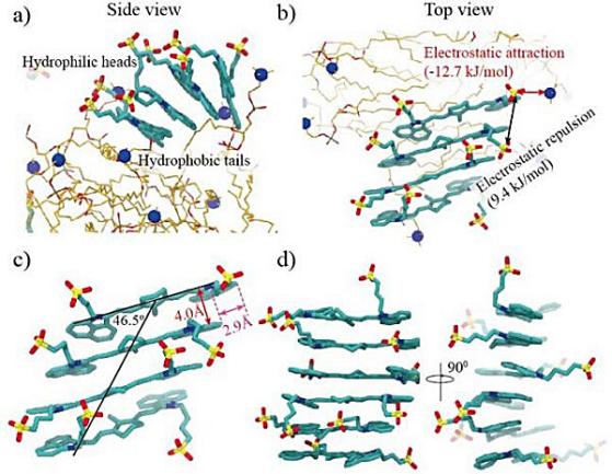 (d)純水中FD-1080的分子動(dòng)力學(xué)模擬的側(cè)視圖。