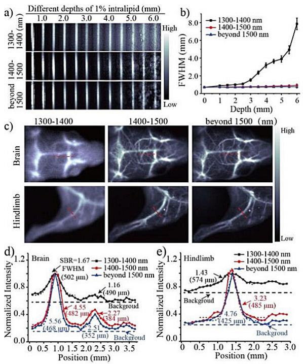 (b)不同成像窗口穿透深度下J-聚集體的FWHM;