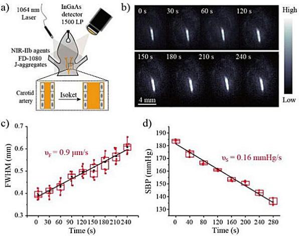 針對(duì)上述問題,團(tuán)隊(duì)報(bào)道了一種新型的NIR-II探針——花菁染料FD-1080 J-聚集體,它是基于花菁染料FD-1080和1,2-二肉豆蔻?;?sn-甘油-3-磷酸膽堿(DMPC)的自組裝而形成的J-聚集體,其最大吸收和發(fā)射波長(zhǎng)均超過1300 nm。J-聚集在生理?xiàng)l件下顯示出較高的親水性和穩(wěn)定性。通過分子動(dòng)力學(xué)模擬證明了磷脂DMPC與花菁染料FD-1080在J-聚集體形成過程中的相互作用。同時(shí),相對(duì)于短波長(zhǎng)區(qū)域內(nèi)的熒光成像,位于1500 nm以上的熒光成像具有最高的成像效果,包括分辨率,信噪比。此外,研究人員證明了利用J-聚集體可以監(jiān)測(cè)臨床使用的Isoket降壓藥給藥后高血壓大鼠頸動(dòng)脈血管的動(dòng)態(tài)變化過程用于評(píng)價(jià)降壓效果。