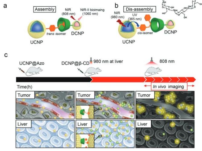 針對(duì)目前存在的問題,研究團(tuán)隊(duì)利用偶氮苯-環(huán)糊精的主客體超分子結(jié)構(gòu)構(gòu)筑了納米顆粒體內(nèi)的聚集體系,并利用穿透深度較深的近紅外光(980 nm)激發(fā)上轉(zhuǎn)換納米顆粒,使其轉(zhuǎn)換為可見光觸發(fā)偶氮苯-環(huán)糊精之間的解離,實(shí)現(xiàn)納米顆粒的體內(nèi)解聚。同時(shí),團(tuán)隊(duì)利用近紅外第二窗口(NIR-II, 1000-1400 nm)稀土納米探針(1060 nm發(fā)射)實(shí)現(xiàn)了動(dòng)物活體的高效成像。該體內(nèi)聚集-解聚體系可被廣泛推廣至其它成像及治療領(lǐng)域。