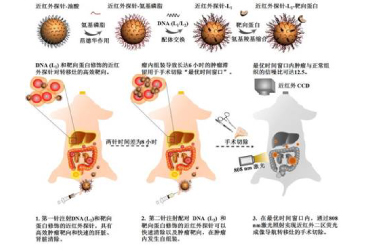 圖1. 表面分別修飾配對DNA(L1/L2)和修飾靶向蛋白的近紅外探針。 對于這兩種配對DNA修飾的探針采用兩針注入法,通過肝臟、腎臟的快速代謝,體內(nèi)正常組織的熒光信號可以降到最低;腫瘤內(nèi)的探針自組裝可以對腫瘤實現(xiàn)長達6小時的穩(wěn)定標記,確保精準的手術(shù)導(dǎo)航。