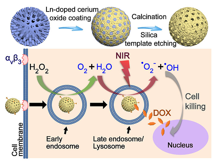 研究團隊設計合成了一種基于鑭系離子摻雜的介孔空心氧化鈰稀土上轉換發(fā)光納米材料(Ce-UCNPs)。這種材料集產氧、光動力和化療協(xié)同治療為一體,并可用近紅外(NIR)光觸發(fā)以實現(xiàn)PDT。特別地,Ce-UCNPs可以通過類酶催化反應有效地分解腫瘤內源性H2O2,原位供應氧氣以提高PDT的效率。同時,Ce-UCNPs具備的介孔空心納米結構和表面腫瘤靶向修飾也可以使這種材料作為藥物載體以提高化療的效果。