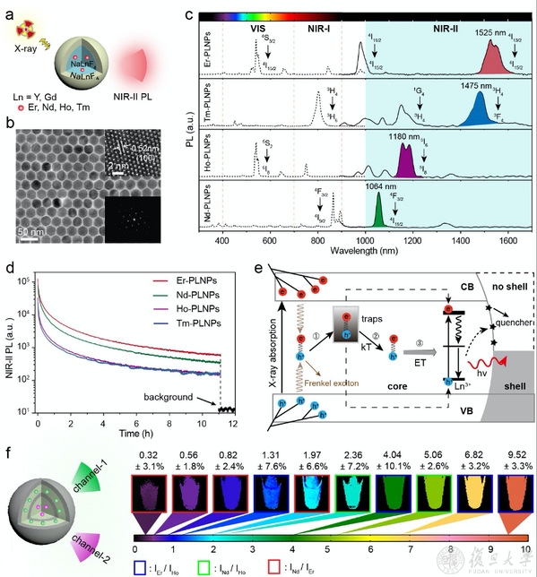 圖1:X射線激活的近紅外第二窗口長(zhǎng)余輝納米探針(PLNPs)示意圖(a),