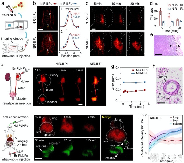 圖2:近紅外第二窗口長(zhǎng)余輝信號(hào)用于血管成像(a-b),