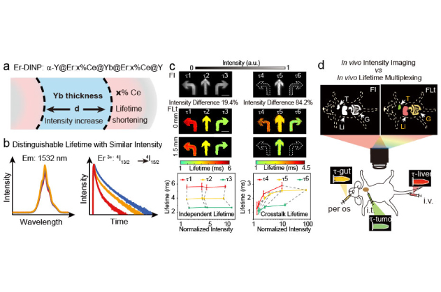 基于不同熒光發(fā)射峰進行的多通道檢測技術(shù)被廣泛用于生物醫(yī)學領(lǐng)域。然而由于活體組織復雜結(jié)構(gòu)對不同波長具有的不同吸收和散射作用,即使利用近紅外二區(qū)熒光在生物組織中低散射和吸收的特性,活體多重檢測的定量準確性仍然有待提高。目前利用鑭系元素摻雜的熒光材料進行近紅外二區(qū)壽命多通道檢測取得了突破性的進展,然而該類材料在構(gòu)筑不同熒光壽命的探針的同時,往往會造成探針之間較大的熒光強度差異,特別是短壽命材料的熒光強度通常較弱,易受到背景噪聲的干擾,從而難以實現(xiàn)多樣品信息的同時精確解析。