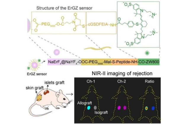 早期診斷異體移植排斥反應(yīng)有助于改善移植受體的免疫相關(guān)管理。目前,臨床使用的芯針活檢方法是有創(chuàng)的,且容易產(chǎn)生采樣誤差。通過(guò)在體熒光成像監(jiān)測(cè)免疫相關(guān)過(guò)程具有無(wú)創(chuàng)、反饋快和靈敏度高等優(yōu)點(diǎn)。鑒于此,研究團(tuán)隊(duì)開發(fā)了一種靈敏的近紅外二區(qū)(NIR-II)熒光納米傳感器(ErGZ)來(lái)實(shí)現(xiàn)對(duì)異體移植排斥反應(yīng)的無(wú)創(chuàng)早期檢測(cè)。