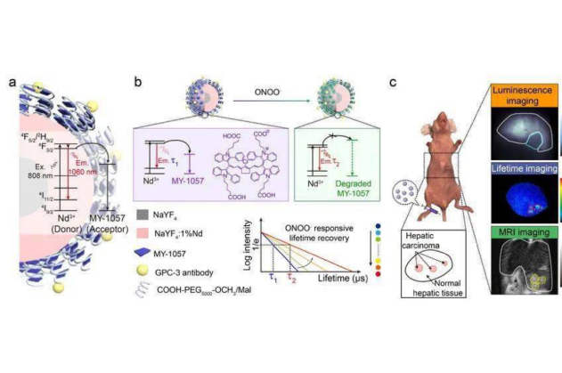 稀土摻雜近紅外二區(qū)下轉(zhuǎn)換納米顆粒作為成像造影劑,被廣泛應(yīng)用于生物體熒光成像、檢測(cè)等領(lǐng)域。然而,在熒光信號(hào)穿透生物組織的過(guò)程中,會(huì)因組織吸收與散射發(fā)生不可避免的熒光信號(hào)強(qiáng)度衰減。這為熒光成像的定性、定量檢測(cè)帶來(lái)了極大困擾。同時(shí),靜脈注射的納米顆粒會(huì)大量被肝臟捕獲,造成極高的熒光強(qiáng)度背景信號(hào),這進(jìn)一步提高了肝臟相關(guān)腫瘤的檢測(cè)難度。