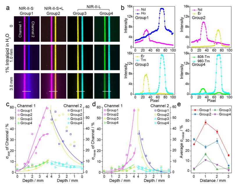 團隊通過理論模擬,基于光子散射和水吸收,將傳統(tǒng)的NIR-IIb窗口擴展到NIR-II-L(1500-1900 nm)窗口。研究團隊開發(fā)了一系列新型的NIR-II-L納米探針,其發(fā)射波長在1852 nm到2842 nm范圍內(nèi)可調(diào)。這些NIR-II-L納米探針實現(xiàn)了對血管和腸道的高分辨率體內(nèi)動態(tài)多重成像,并在淋巴管、腫瘤和腸道上提供了多通道成像。這些NIR-II-L探針在體內(nèi)多重檢測中沒有相互干擾,是高對比度的強大工具,有望揭示活體內(nèi)的生理過程。